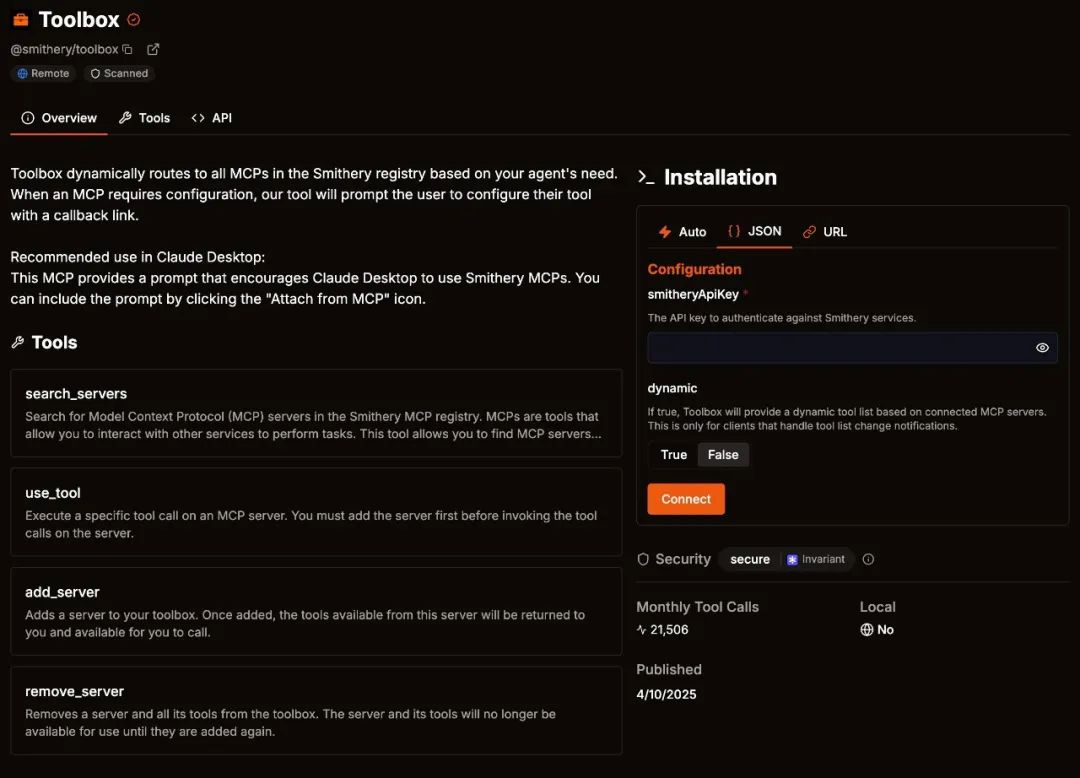 smithery.ai 是当前最受欢迎的 MCP 插件⽹站之⼀,聚集了⼤量 MCP 列表和活跃⽤户。其中 @smithery/toolbox 是 smithery.ai 官⽅推出的 MCP 管理⼯具。