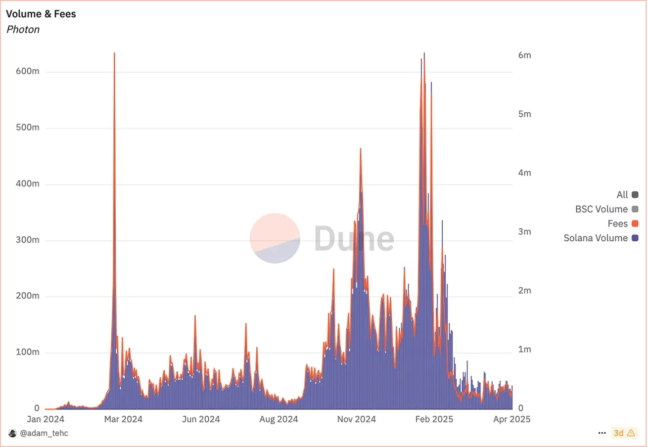 这种创新不仅仅在于资产本身,更在于 Solana 上更便宜、更快的交易,以及 Telegram 所提供的传播渠道所带来的行为变化。季节性应用往往难以保持用户粘性,但其中的资本流动速度非常高,以至于即使这个行业在八到九个月的时间里崩溃了也没关系。用户会支付极高的溢价,而在淘金热中卖铲子的人往往会过得很好。下面的图表展示了 Photon 的情况。