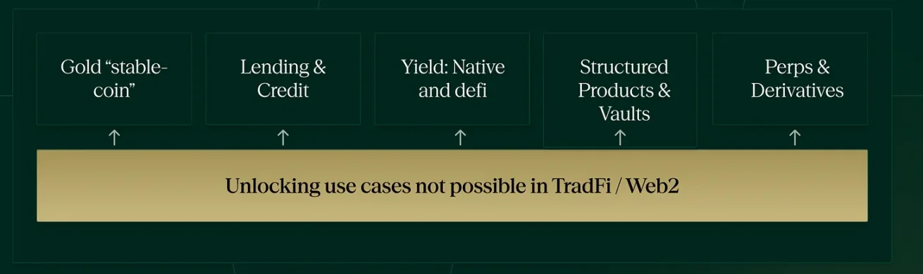 像黄金这样的大宗商品也会有一个稳定的买盘,尽管在早期可能效率不高,因为存在一个足够大的传统市场来为其定价。这与代币化的房地产或初创企业股权不同,因为黄金的定价是达成共识的,而不依赖于特定地域或行业偏好的细微差别。Usman 通过下面的图片解释了它在 Web3 中的作用。他的核心观点是,任何链上的黄金表现形式都必须比其 Web2 时代的对应形式更好,才能具有相关性。