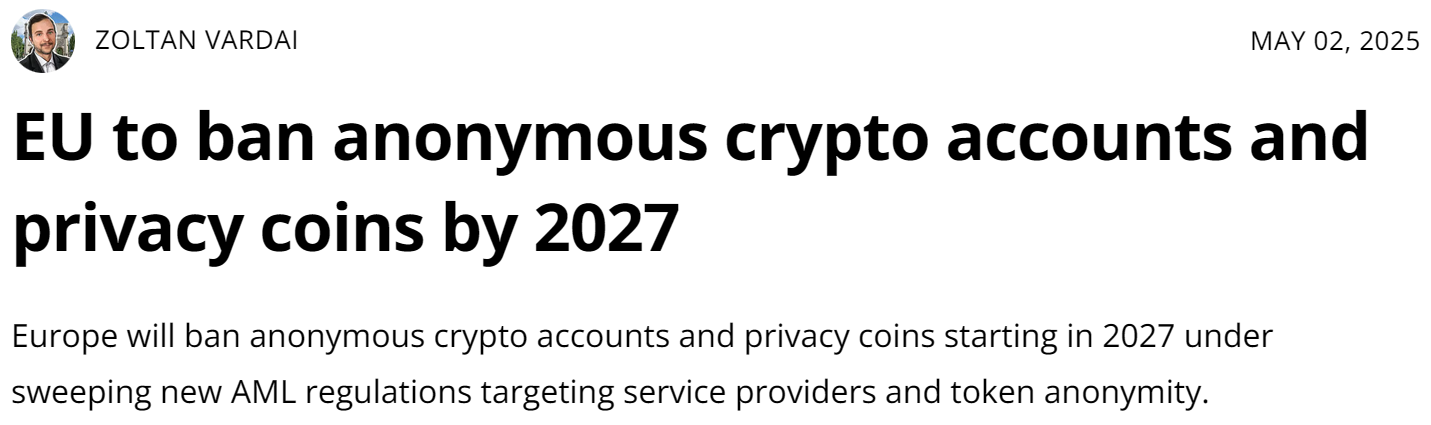 - 欧盟将于 2027 年全面禁止匿名加密账户与隐私币交易