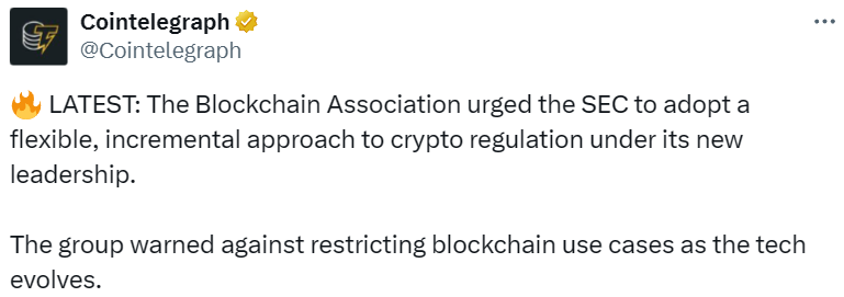 - 区块链协会敦促美国 SEC 采取灵活的加密监管方式