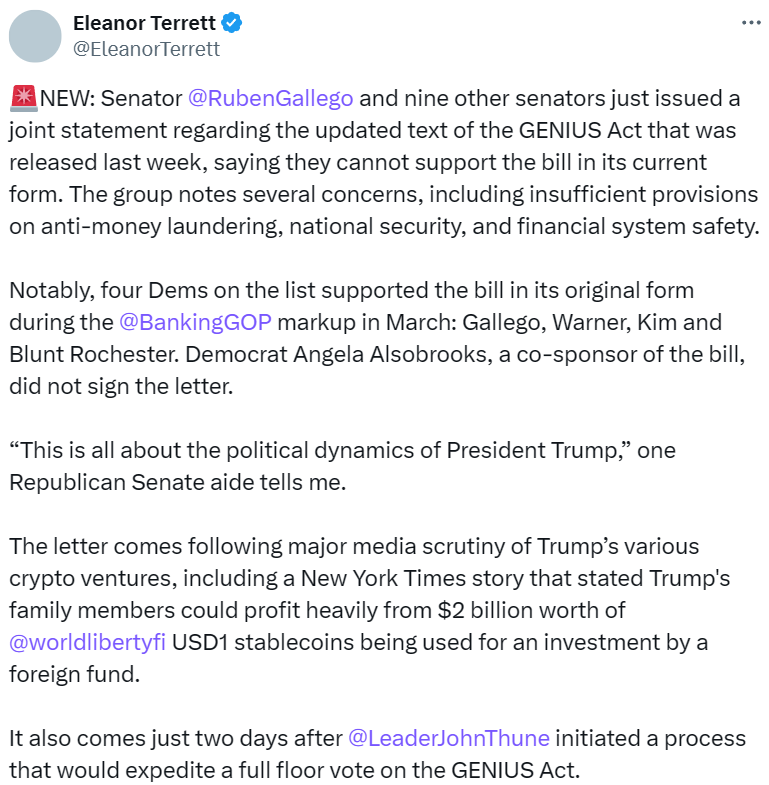 - 美国 10 位参议员联名反对稳定币监管法案《GENIUS》更新版