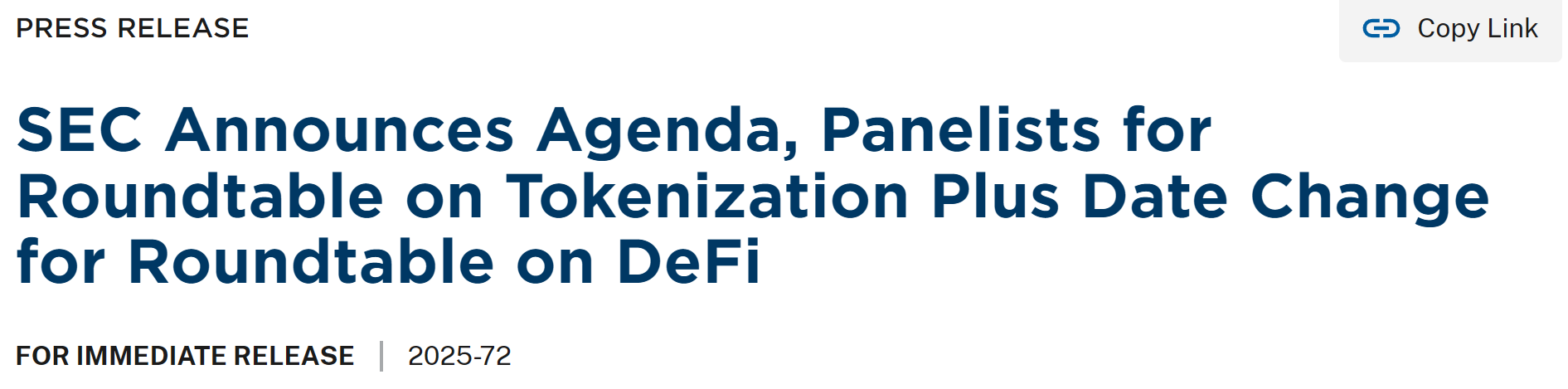 - 美 SEC 宣布第四次加密圆桌会议将于 5 月 12 日举行
