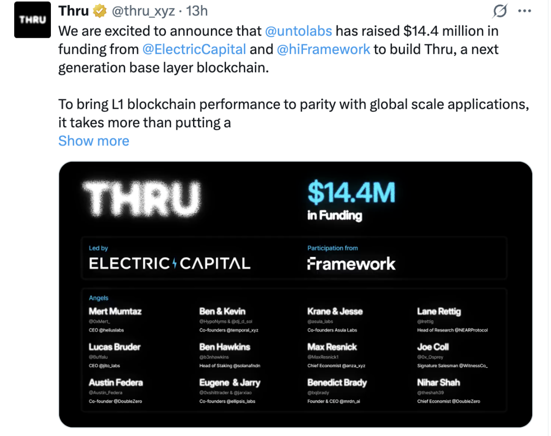 根据 Fortune 报道,Unto Labs 完成了由 Framework Ventures 和 Electric Capital 领投的 1440 万美元融资,公司的估值达到 1.4 亿美元。资金将主要用于两个方面:一是扩充团队规模,二是加速 Thru 区块链的研发和生态建设。