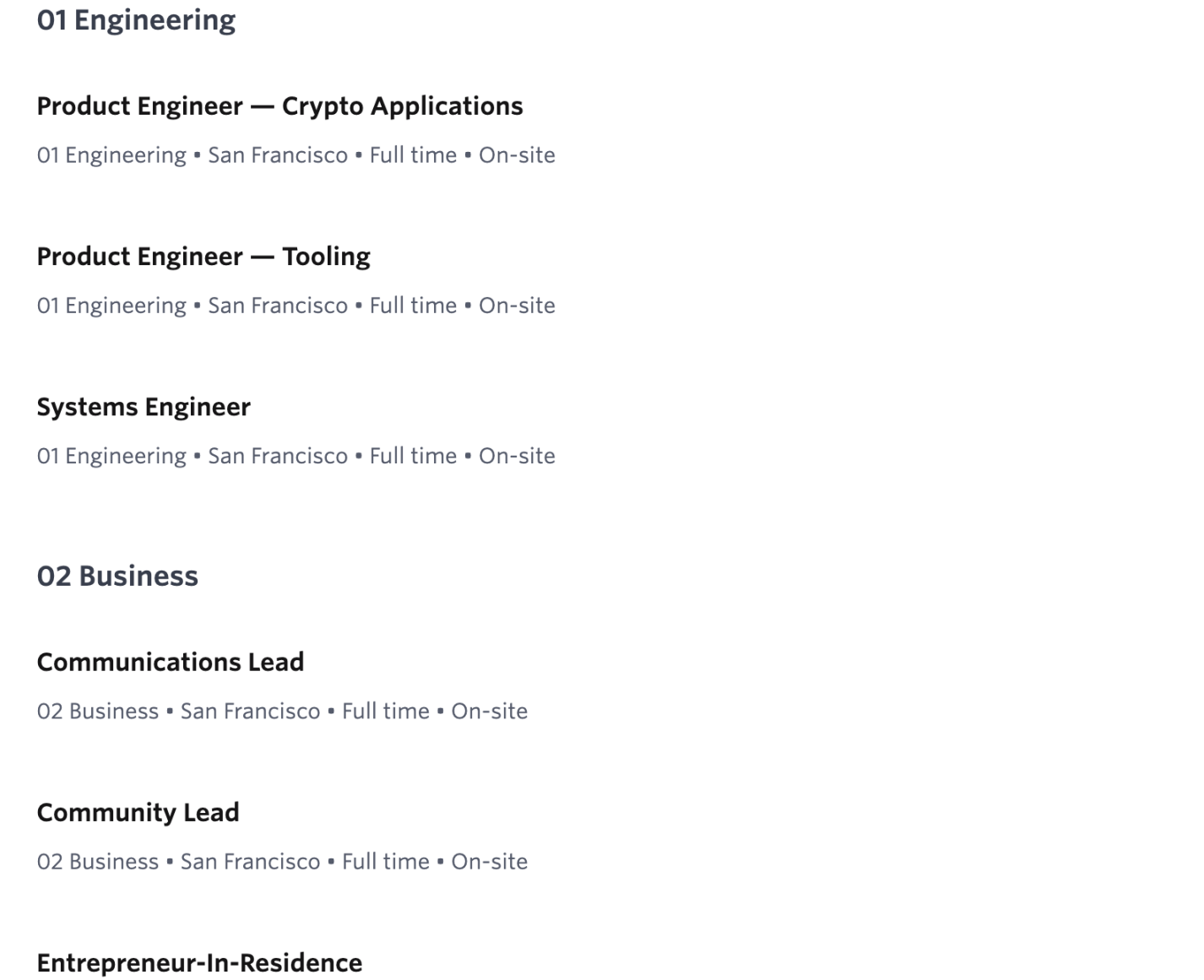 据其招聘页面,目前有加密应用工程师、Tooling 工程师、系统工程师三个技术岗位以及交流负责人、社区负责人等三个商务岗位开放,均要求在美国旧金山全职线下办公。