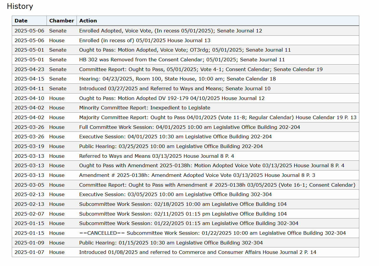 HB 302 法案在 1 月被引入众议院。在新罕布什尔州,一项法案通过,首先需要草拟法案。草案可由新罕布什尔州总议会(General Court)的 400 名众议员或 24 名参议员提出。州政府机构负责人、州长、公民或利益团体若希望提出立法建议,必须找到一位议员作为提案人。