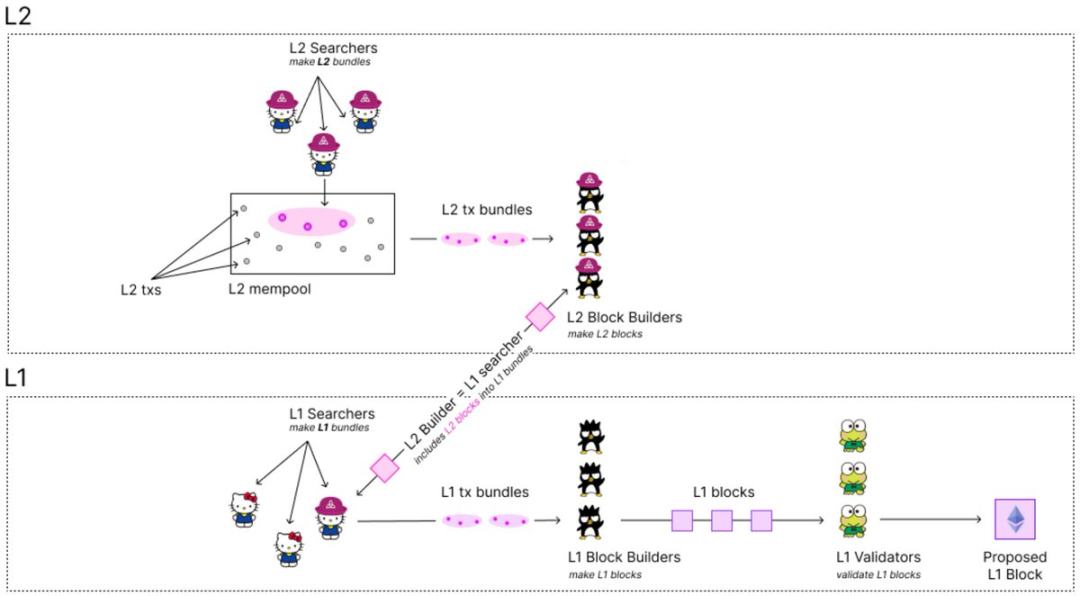 第一步,L2 搜索者将 L2 交易打包并发送给 L2 区块 Builder;