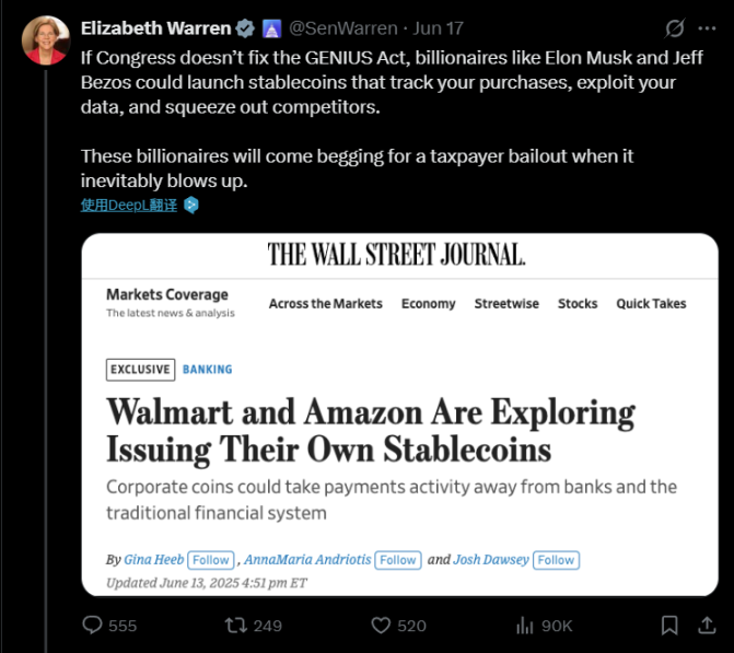 然而前一天,著名民主党「加密鹰派」、美国参议院银行委员会资深民主党议员 Elizabeth Warren 依旧保持了强硬态度。她指出,GENIUS 法案存在一个重大漏洞,允许大科技公司和大型零售商发行自己的私人货币,并将其结构化为稳定币。如果国会不修改《GENIUS 法案》,埃隆 - 马斯克(Elon Musk)和杰夫 - 贝索斯(Jeff Bezos)等亿万富翁就会推出稳定币,追踪你的购物行为,利用你的数据,挤垮竞争对手。