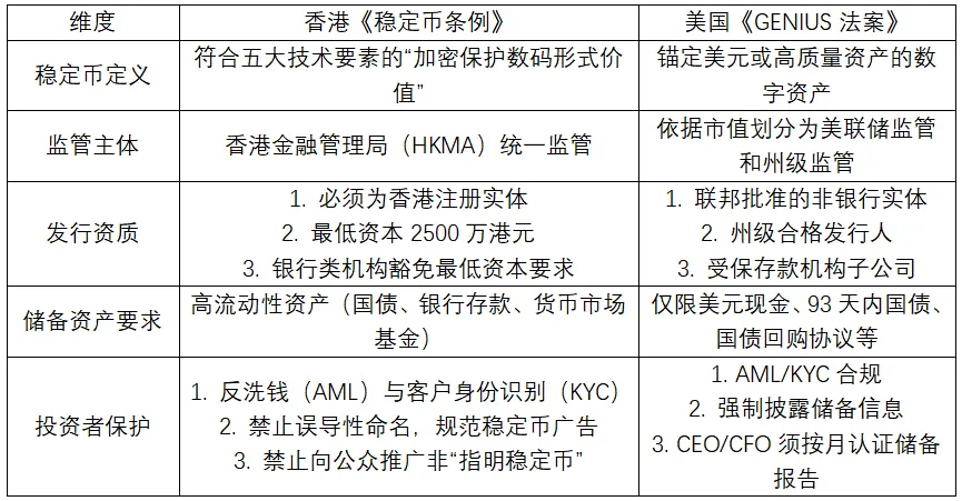 《稳定币条例》与《GENIUS 法案》都聚焦于监管与法定货币或其他资产挂钩的稳定币,均要求 100% 资产覆盖和储备资产隔离保护,并遵守国际反洗钱(AML)规章规避刑事风险。但是,具体而言,二者在许多维度存在不同,本节将这些细微差别整理成表格: