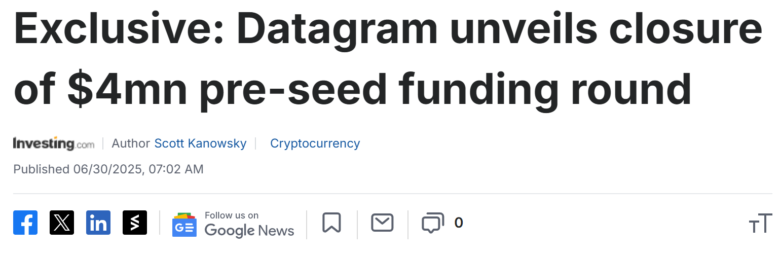 - AI 驱动的超结构网络 Datagram 完成 400 万美元 Pre-Seed 轮融资,Blizzard the Avalanche Fund 领投