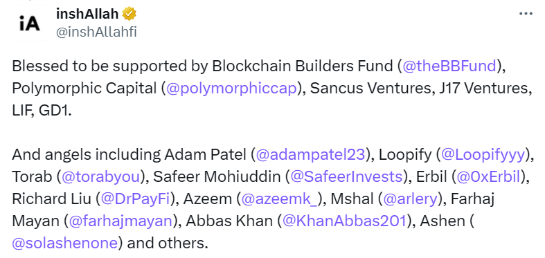 - 伊斯兰 DeFi 项目 inshAllah 完成 210 万美元种子轮融资,Alliance DAO 领投