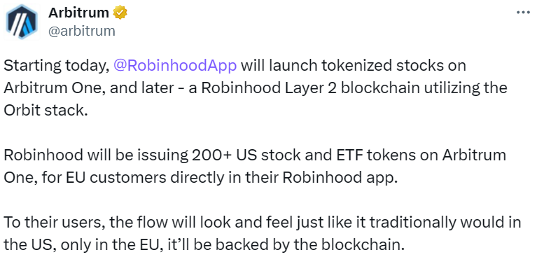 - Arbitrum 在 X 平台发文表示,Robinhood 将在 Arbitrum One 上推出代币化股票