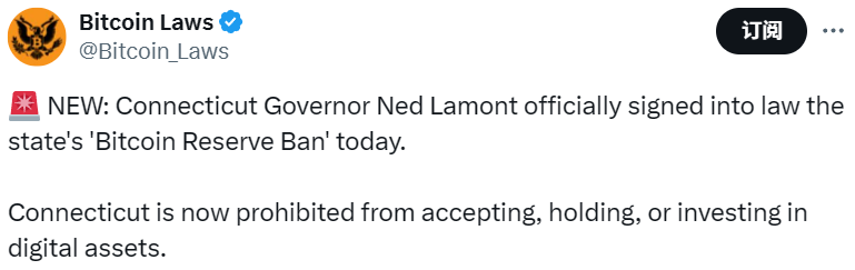 - 美国康涅狄格州州长正式签署比特币储备禁令