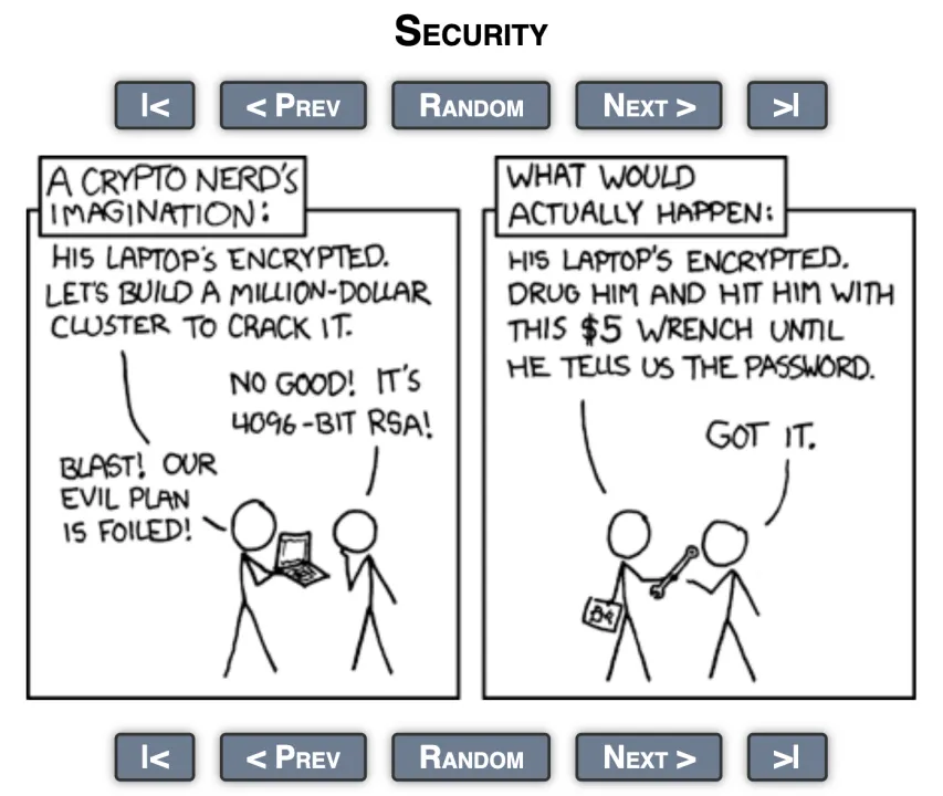 “你可以有最强的技术保护,但攻击者只需要一把扳手,把你打趴下,你就会乖乖说出密码。”5 美元扳手攻击($5 Wrench Attack)这一表达最早出现在网络漫画 XKCD 中,攻击者不使用技术手段,而是通过威胁、勒索甚至绑架等方式,迫使受害者交出密码或资产。