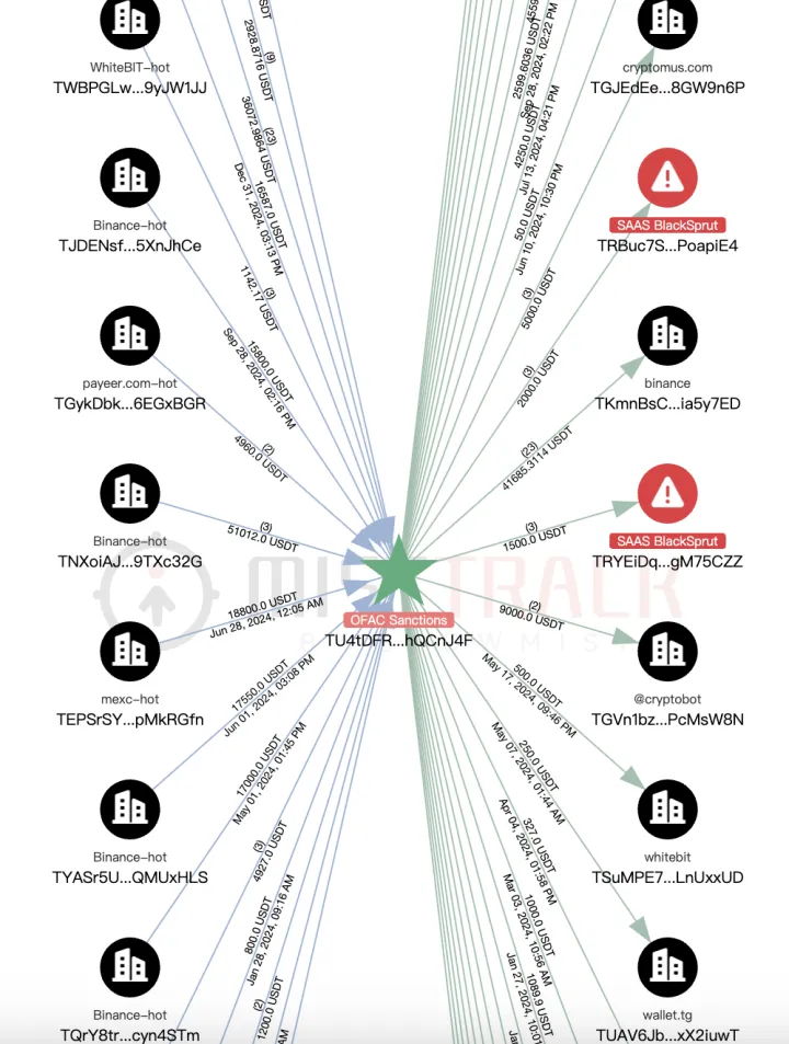 根据链上反洗钱与追踪平台 MistTrack 分析,被制裁地址 (TU4tDFRvcKhAZ1jdihojmBWZqvJhQCnJ4F) 自 2023 年开始活跃,已累计接收超过 35 万美元的 USDT。