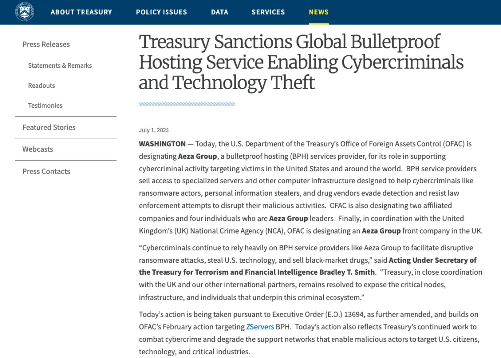 对 Aeza Group 的制裁表明,全球监管正在将打击目标从攻击者,延伸到其背后的技术服务网络。托管商、匿名通信工具、支付通道,正成为合规打击的新焦点。