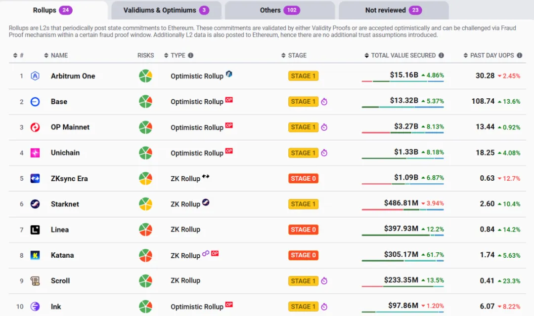 其实早在 2022 年,Vitalik 就在博客中批评了大部分 Rollup 的 Training Wheels(辅助轮)架构,直言其依赖中心化运维、人工干预保障安全,经常使用 L2Beat 的用户应该对此也非常熟悉,其官网首页就显示有一个相关的关键指标——Stage: