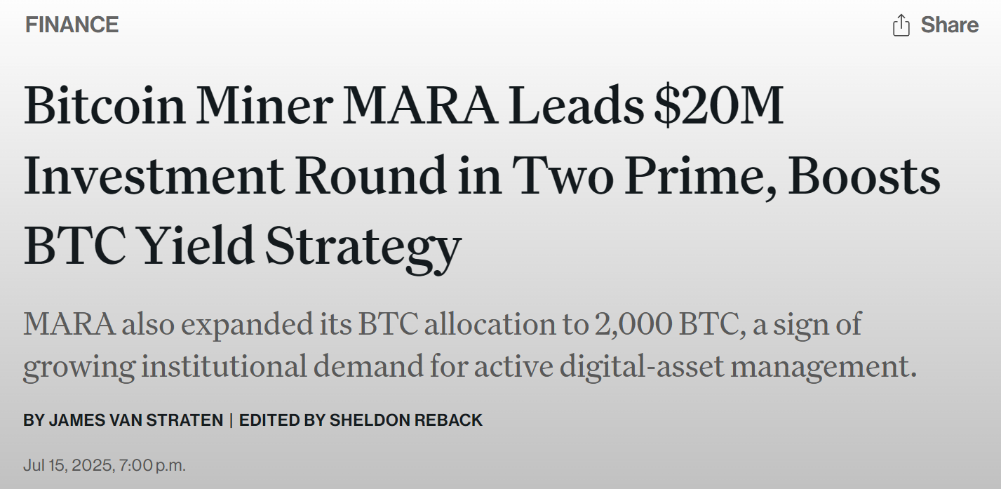 - 数字资产管理公司 Two Prime 完成 2000 万美元股权融资,MARA 领投