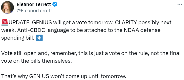 - GENIUS 法案将进行程序性投票,CLARITY 或于下周表决