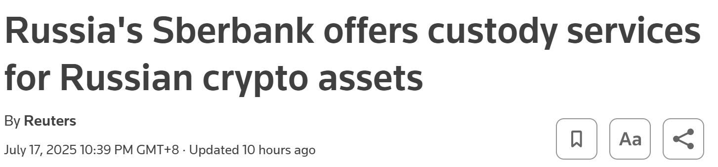 - 俄罗斯最大银行 Sberbank 拟为俄罗斯加密资产提供托管服务