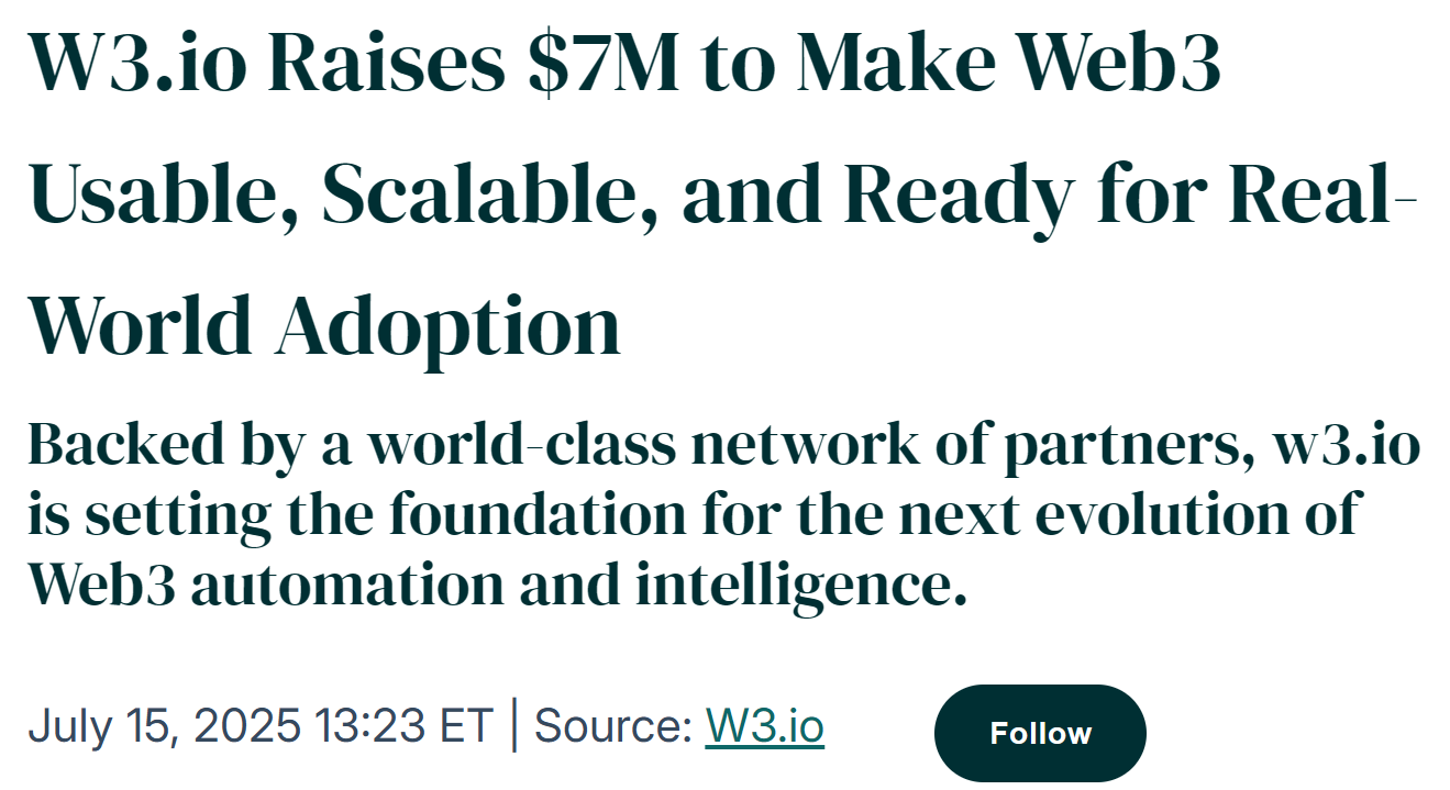 - Web3 智能层 W3.io 完成 700 万美元种子轮融资,Blockchange Ventures 领投