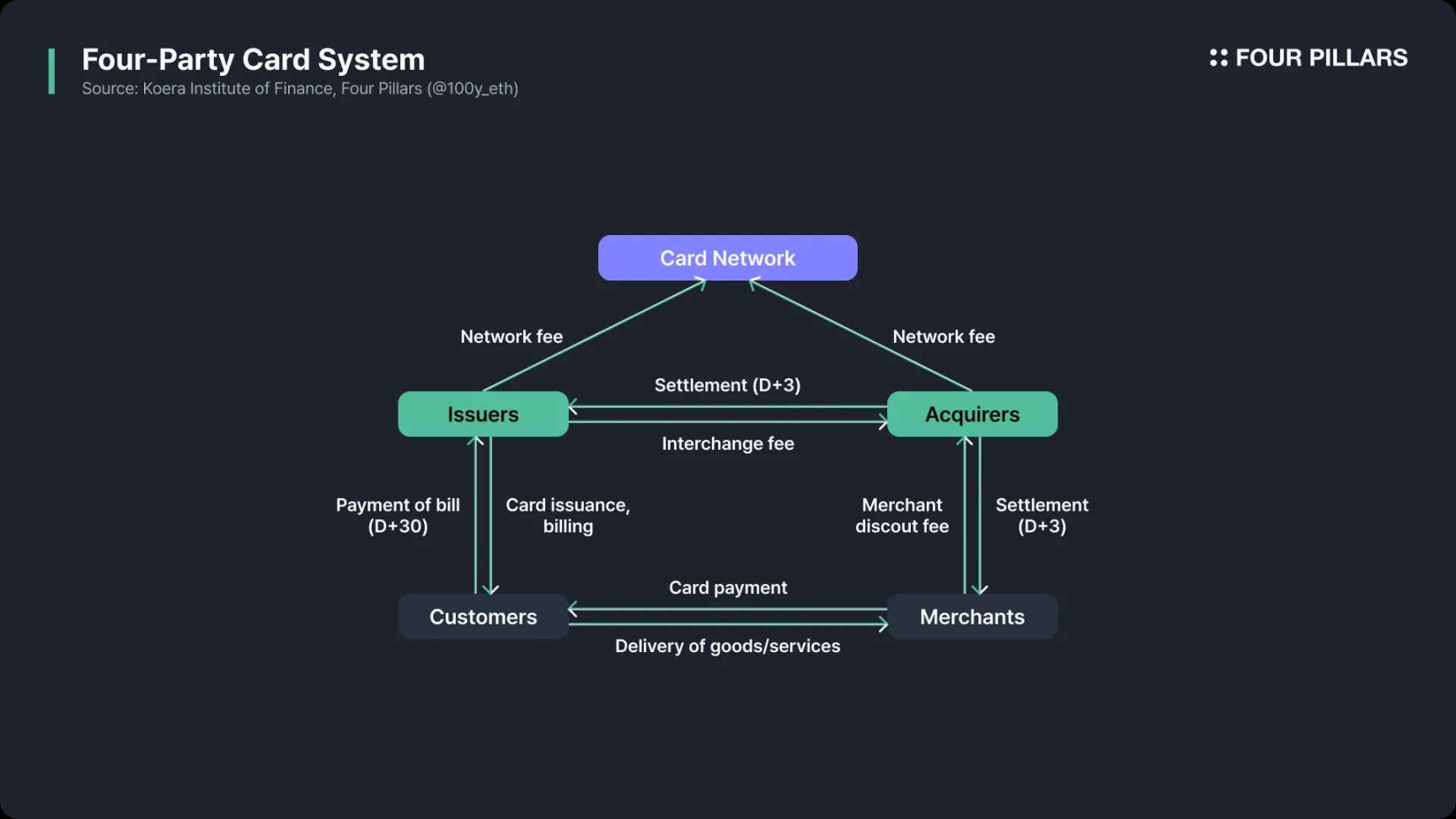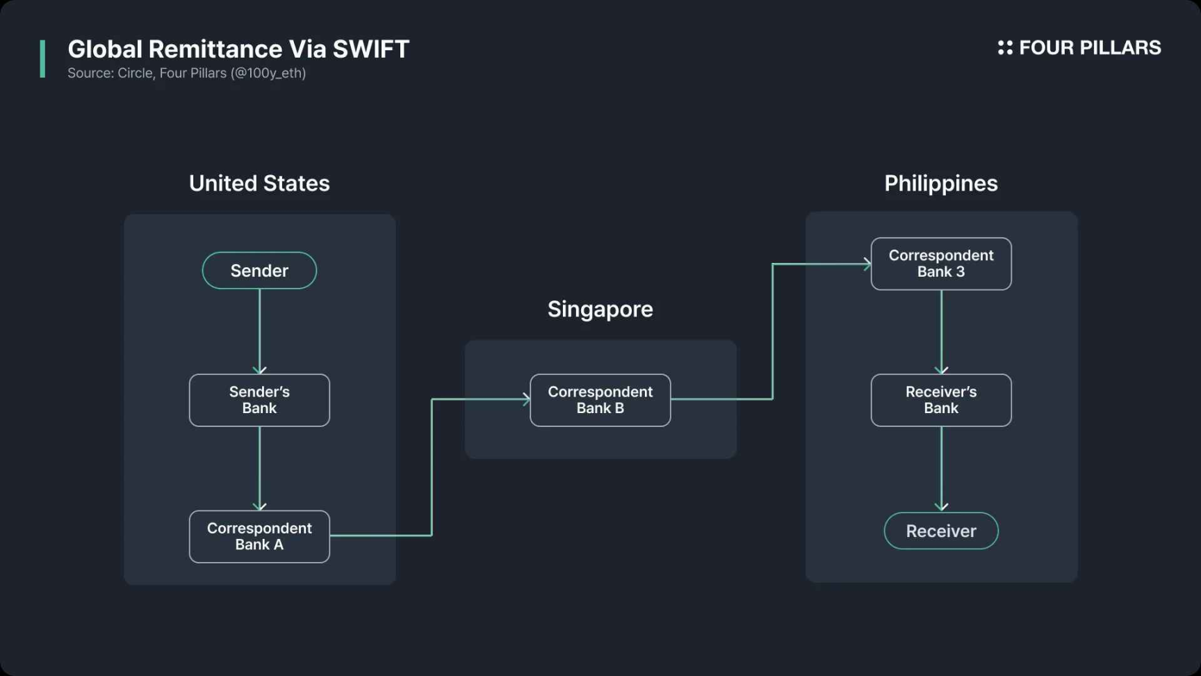 区块链和稳定币能否降低这些费用?第一个潜在的成本节约点在于全球交易。当商家与持卡人位于不同国家时,结算必须通过 SWIFT 系统,而若用区块链或稳定币替代这一流程,可显著降低成本。