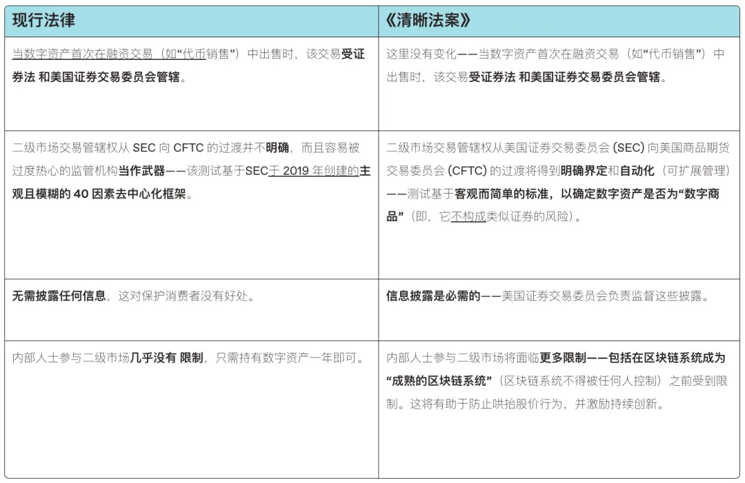 《CLARITY 法案》与之前的立法成果,例如《FIT21 法案》相比如何?《CLARITY 法案》实际上吸取了《FIT21 法案》的经验教训,并在其基础上进行了改进: