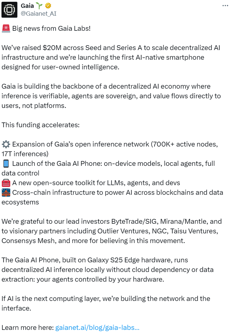 - AI 推理平台 Gaia 完成 2000 万美元种子轮和 A 轮融资,Mantle 等领投