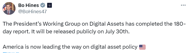- 白宫首份加密政策报告将于 7 月 30 日发布