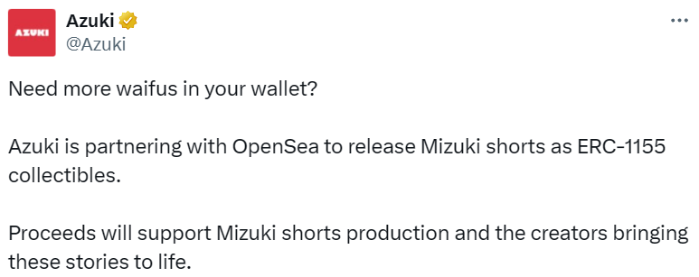 - Azuki 与 OpenSea 合作发行 Mizuki 短片 ERC-1155 收藏品