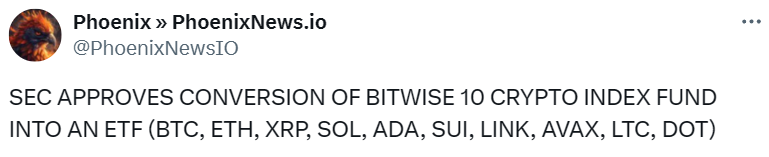 - 美 SEC 批准将 Bitwise 10 加密指数基金转换为 ETF