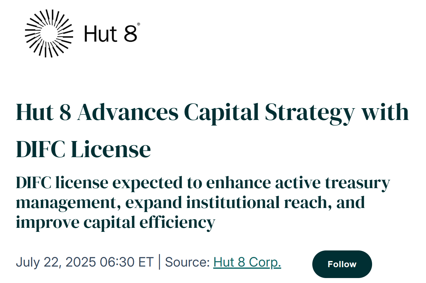 - Hut 8 宣布旗下子公司获得迪拜 DIFC 牌照拟探索衍生品市场