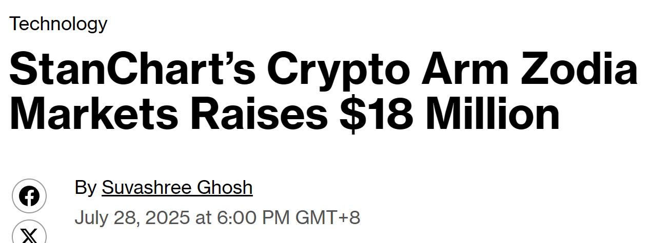- 渣打银行旗下加密交易平台 Zodia Markets 完成 1825 万美元融资