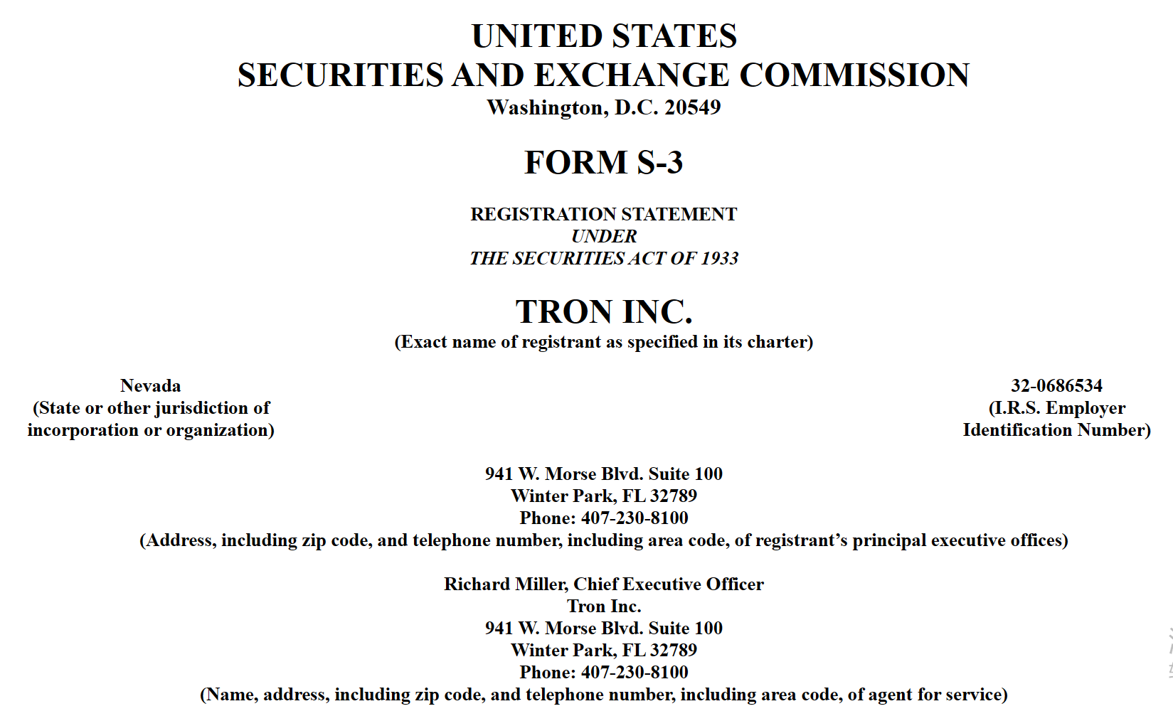 - Tron Inc. 已向美国 SEC 提交最高 10 亿美元的混合证券注册申请
