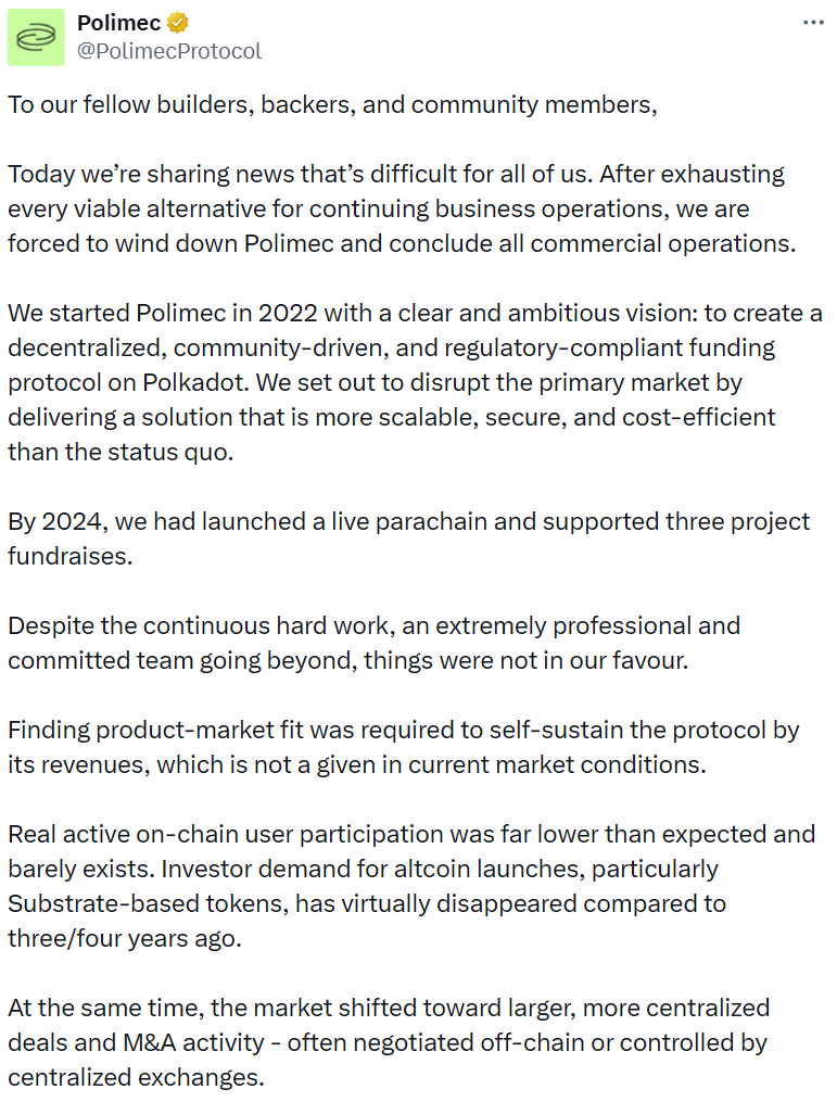 - 波卡生态去中心化融资平台 Polimec 宣布停止运营