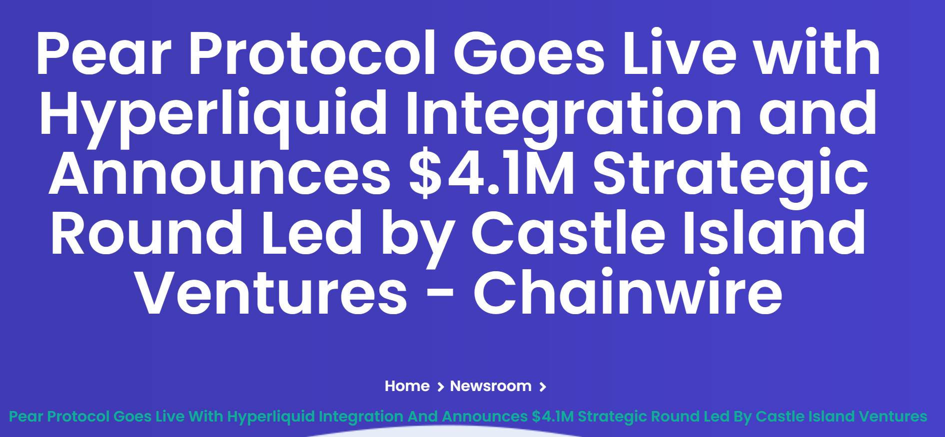 - 交易平台 Pear Protocol 完成 410 万美元战略融资,Castle Island Ventures 领投