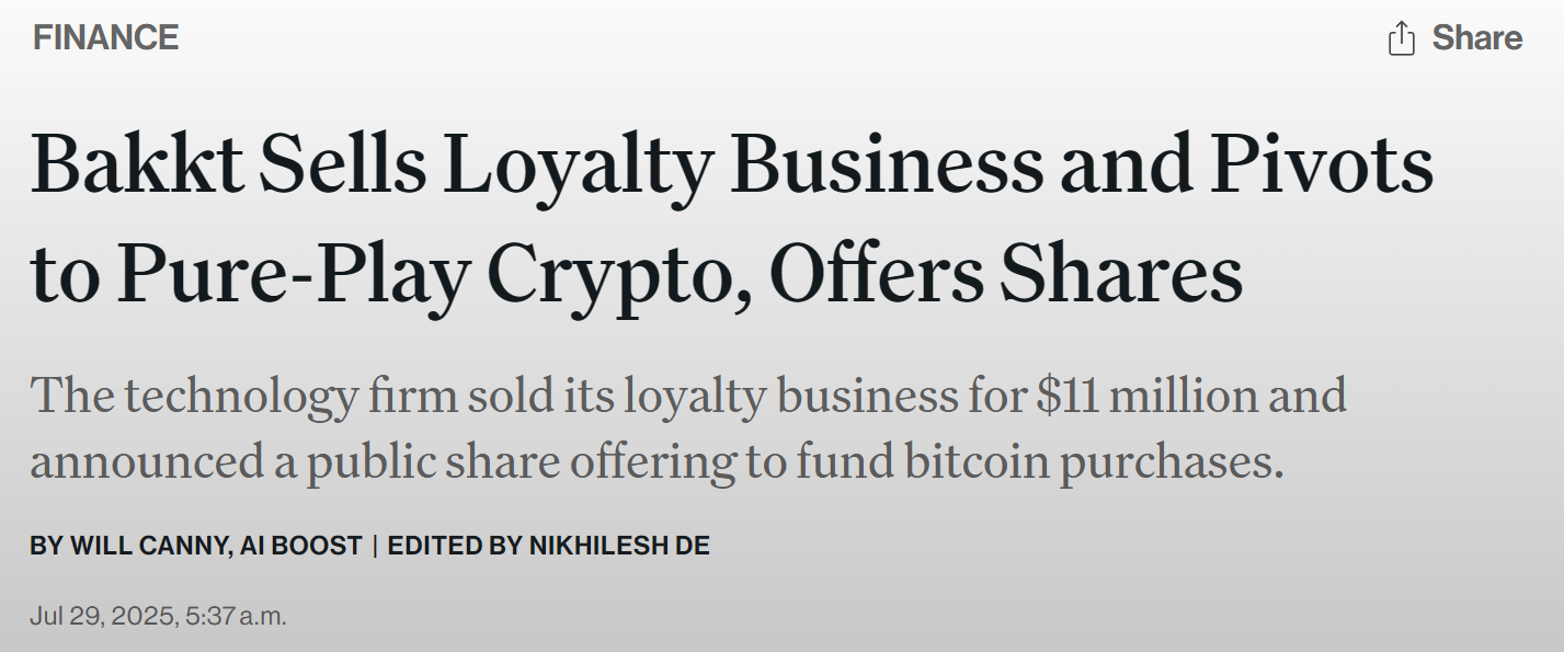 - 纳斯达克上市公司 Bakkt 出售忠诚度业务