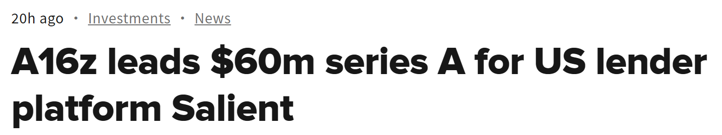 - 贷款平台 Salient 完成 6000 万美元 A 轮融资,a16z 领投