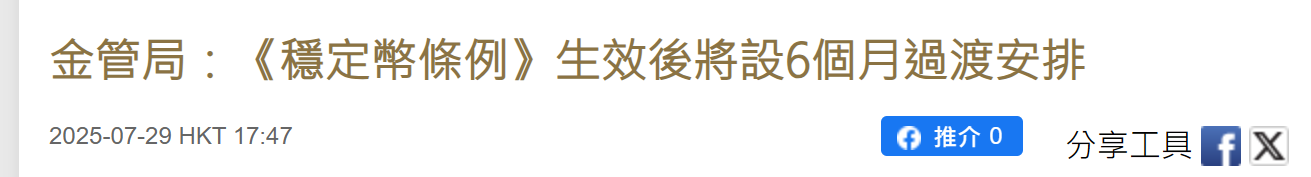 - 香港金管局:《稳定币条例》生效后将设 6 个月过渡安排