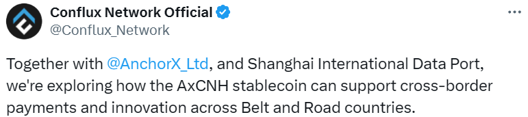 - Conflux 宣布正与合作伙伴探索 AxCNH 稳定币在一带一路国家的应用
