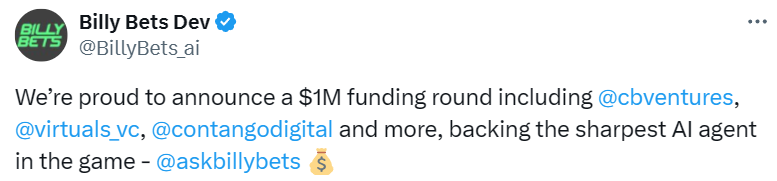 - 基于 Virtuals 的 AI 代理 Billy Bets 完成 100 万美元融资,Coinbase Ventures 参投