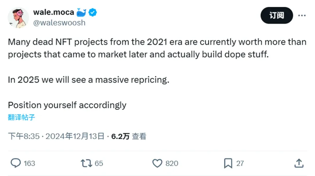 社区成员 @waleswoosh 预测称:"2025 年,一个顶级 NFT 项目可能不复存在,而我们将看到几个地板价高于 50 ETH 的 NFT 项目,今年将是重新定价和实际价值的一年。"