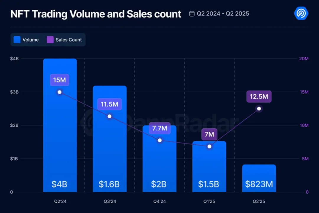 据 DappRadar 数据显示:2025 年第二季度,尽管 NFT 交易总额因高价收藏品减少而下滑,但交易笔数却从约 702 万笔暴涨 78% 至 1250 万笔,独立买家数量也从 65.1 万人大幅增长 44% 至 93.6 万人。