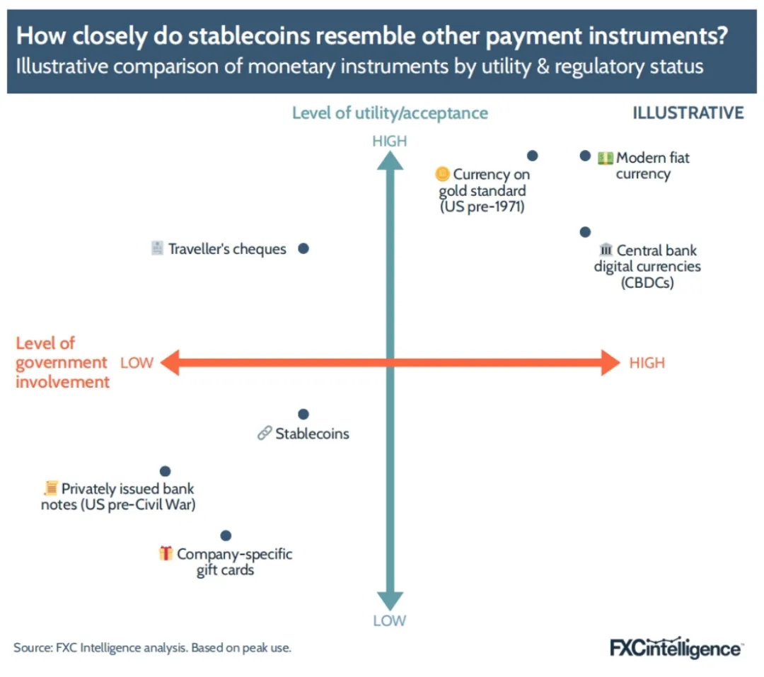 然而,质疑亦随之而来,核心在于:稳定币究竟属于何种货币工具?这引发了大量类比,最常见的参照物是美国内战前各州银行发行的私人纸币。不过,那些私人纸币最终与国家货币分离,且因发行地与接受范围有限而带有 “门槛”;稳定币则不同——它们只是政府法币的 “数字化替身”。