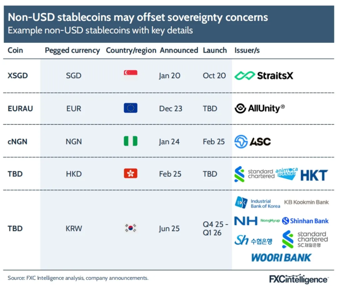 这一挑战并不局限于欧洲。世界各地正掀起一股发行本币锚定稳定币的浪潮——其公开目标正是提升当地货币在跨境支付中的使用率。Circle 的 Chandhok 预计,这一趋势将持续,并断言 “每个国家最终都会拥有自己的稳定币”。