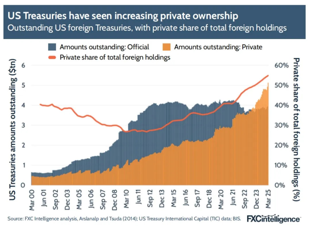 近年来,多国纷纷采取行动减少对美元的依赖。美国制裁的影响,以及特朗普政府时期的部分外交政策,加速了各国转向替代货币的进程。这一趋势体现在外国持有美国国债的数据上:国际清算银行(BIS)数据显示,自 2021 年起,外国政府持有的美债开始下降,并在随后几年基本保持平稳,而私人部门持仓则持续上升。然而,稳定币似乎正在扭转这一势头。