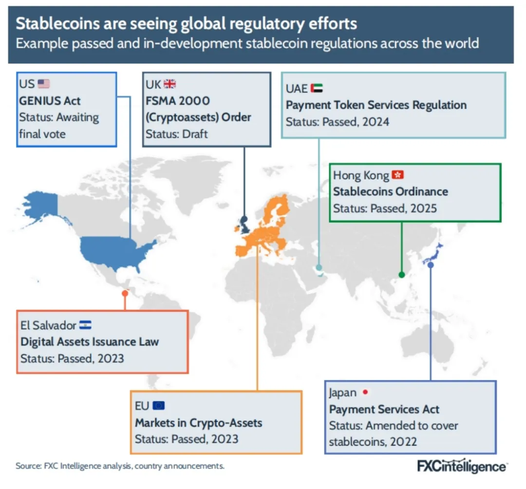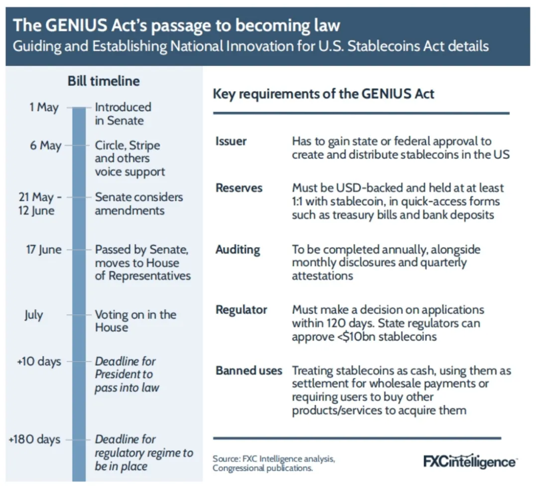在美国,这一进程体现为《GENIUS 法案》(Guiding and Establishing National Innovation for US Stablecoins Act)。这部联邦法律明确了稳定币的使用、发行与维护规则,包括储备资产的构成与审计要求。其条款大体与 Circle 和 Paxos 的现行做法一致,同时封堵了那些缺乏自律的玩家可能出现的掠夺性行为。该法案已经由美国总统签署生效。对于众多以美国为重点的行业参与者而言,这部法律被视为稳定币在支付领域 “开闸放水” 的信号。