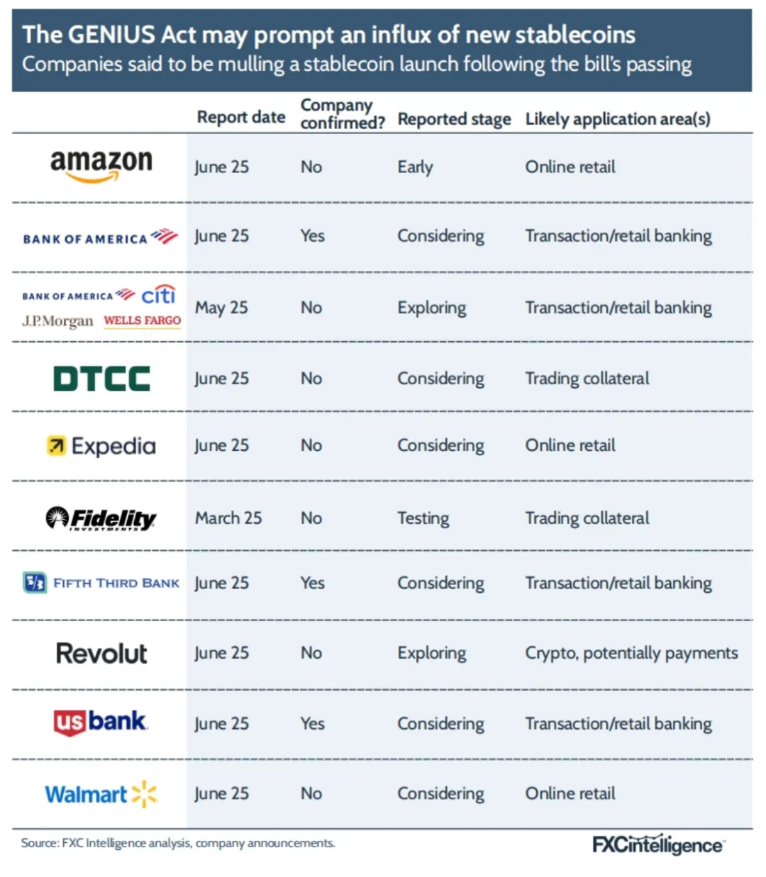 虽然《GENIUS 法案》最终会让多少美元稳定币流通尚未可知,但已有一大批机构公开或据称正在考虑发币。公开表态的包括美国银行、五三银行、合众银行等;而亚马逊、沃尔玛、Expedia 等消费品牌也被传在研究自有稳定币——可视作过去十年流行的数字钱包礼品卡的升级版。