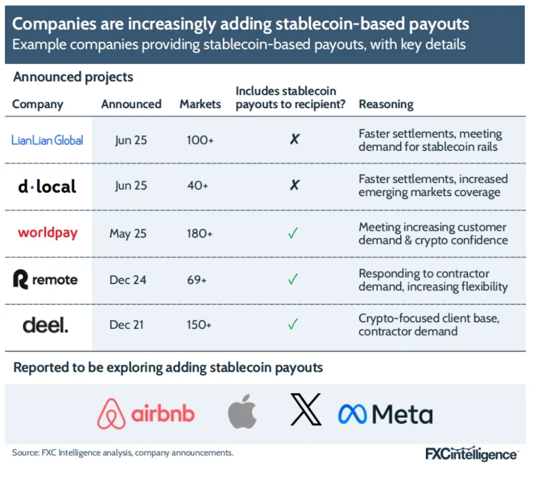 稳定币及区块链技术日新月异、金融支付市场格局瞬变,业务合作的定位也正在随之改变。FXC Intelligence 这份百来页的稳定币支付一线市场报告 The State of Stablecoin in Corss Board Payments(The 2025 Industry Primer)是一份宝贵的稳定币支付实操手册,其整合了 FXC Intelligence 的跨境支付数据、广泛调研及 14 位行业一线专家观点。