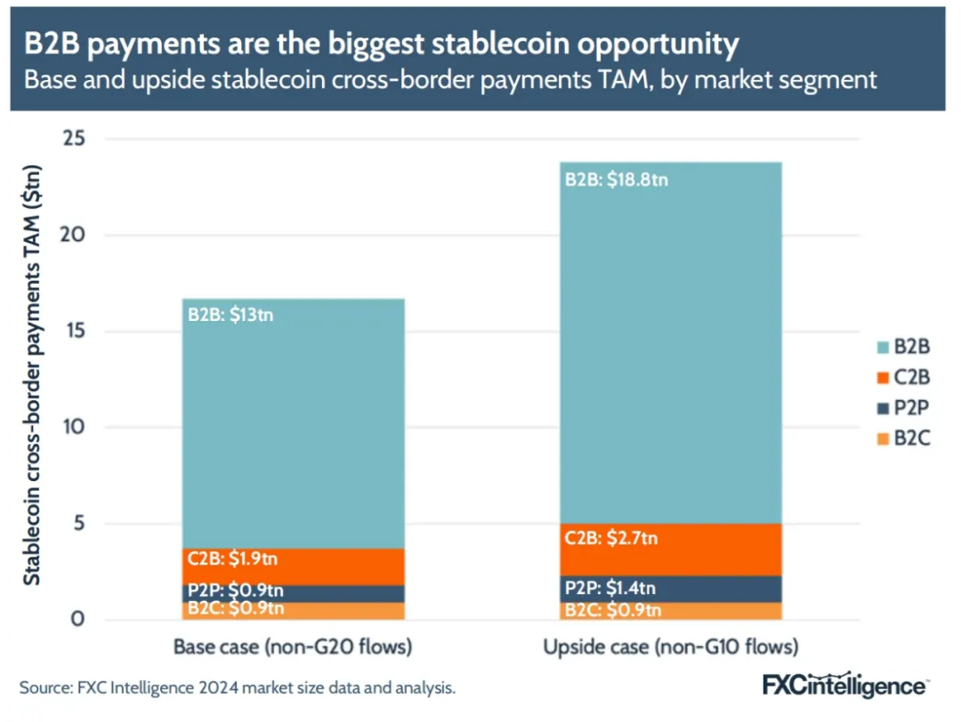FXC Intelligence 此前发布的数据显示,2024 年全球跨境支付总规模(含批发业务)约 194.8 万亿美元,其中非批发部分为 40 万亿美元。目前稳定币在跨境支付中的实际规模仍停留在 “数十亿美元” 量级,占整体市场不足 1%。但其可及市场(TAM)远高于此。